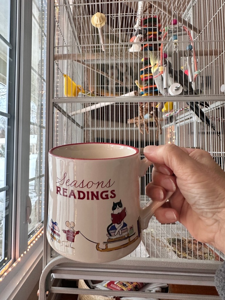Surprisingly, I even had time to chill this afternoon. Here I am enjoying a latte in my new mug, a gift from my son, featuring the only kind of cat allowed in a house with birds.