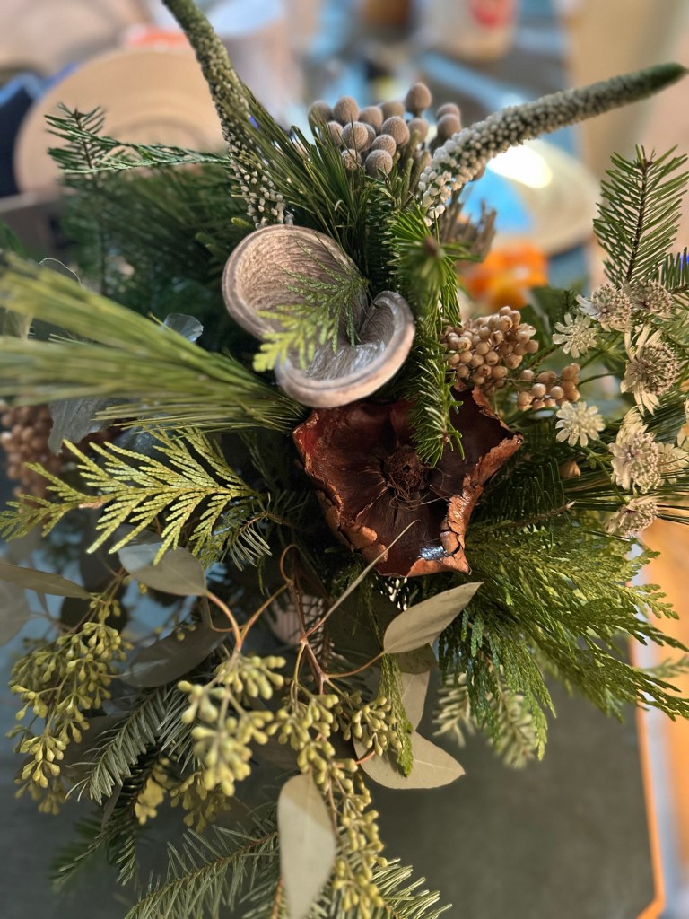 Soon after the food was sorted out, the table centrepiece I ordered from the local florist arrived, all bird-friendly foliage. It is lovely with a scent of pine and cedar.